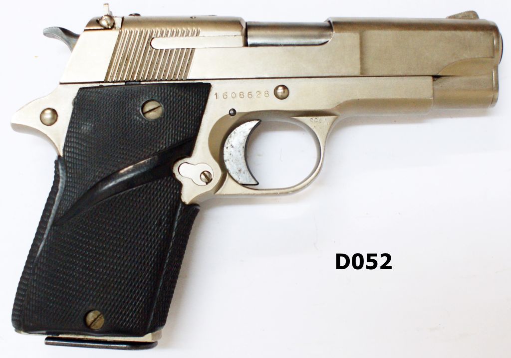 Compact carry gun with satin nickel finish and Pachmayr rubber grips. Very good plus condition.