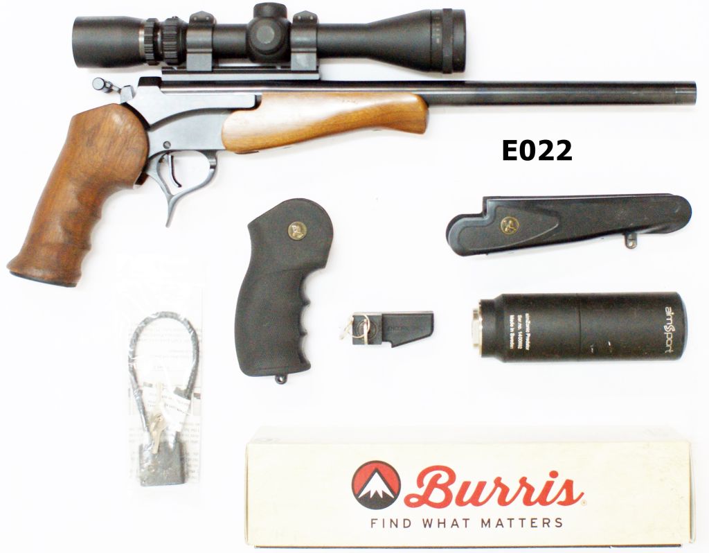 Includes original T/C factory box and spare Pachmayr grip & fore-end. Scoped with Burris 3-12×32 handgun scope which includes original box and instruction manual. Barrel of 14,57″/380mm, wooden grip and fore-end. Muzzle threaded for silencer, Aimzonic Predator silencer included. Excellent condition.