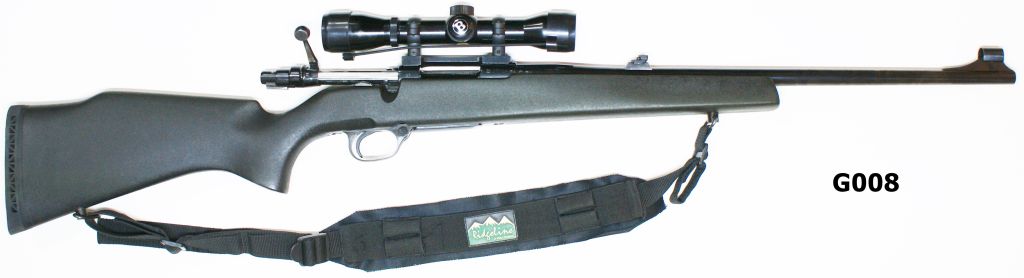 Bushnell Banner Scope on Lynx type one-piece steel mounts. Open sights to 20 barrel. Synthetic stock. Mini-Mauser type action. Excellent condition.