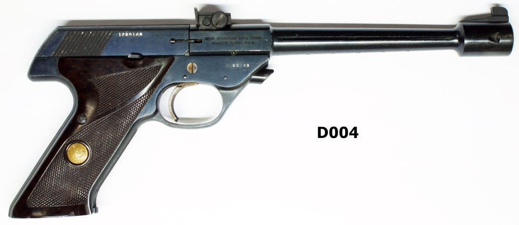 Micro-adjustable sights to 8″ barrel with weighted & vented muzzle and groovedbarrel ribs for sliding weights. Chequered brown grips with”Hi-Standard”logothem. Good plus condition