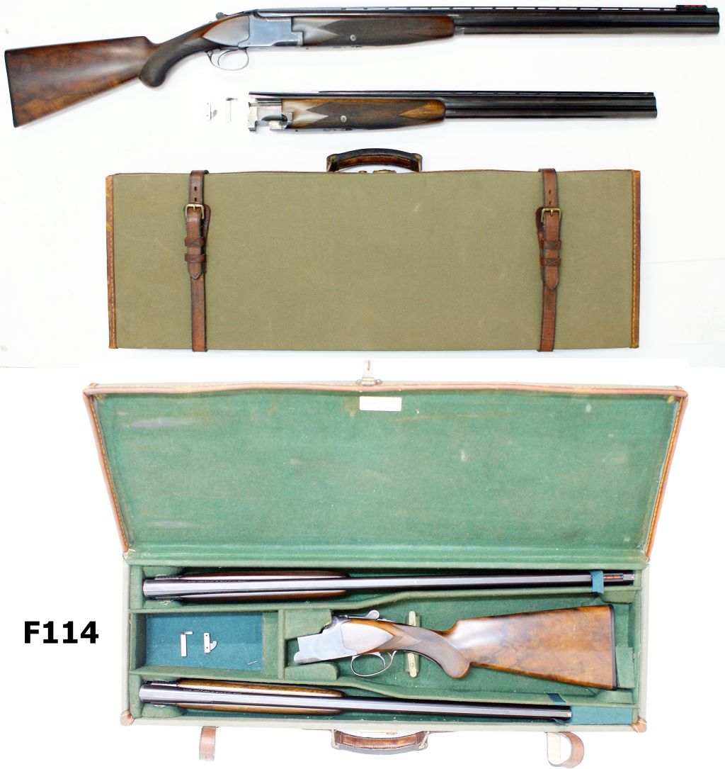 In hard canvas covered, leather trimmed Brady gun case in very good condition.Two barrel set with lengths of 30″ choked full & half and 26,5″, choked 1/4 &1/4 .Semi-pistol grip stock of well figured walnut and L.O.P. of 14,25″. Border engravingto action. Single trigger, ejector action. Some wear to finish on tang of pistol grip,rest of blued finish in very good condition. Excellent bores, tight action, the only faultto the gun is a faulty ejector on the lower skeet barrel which needs replacement