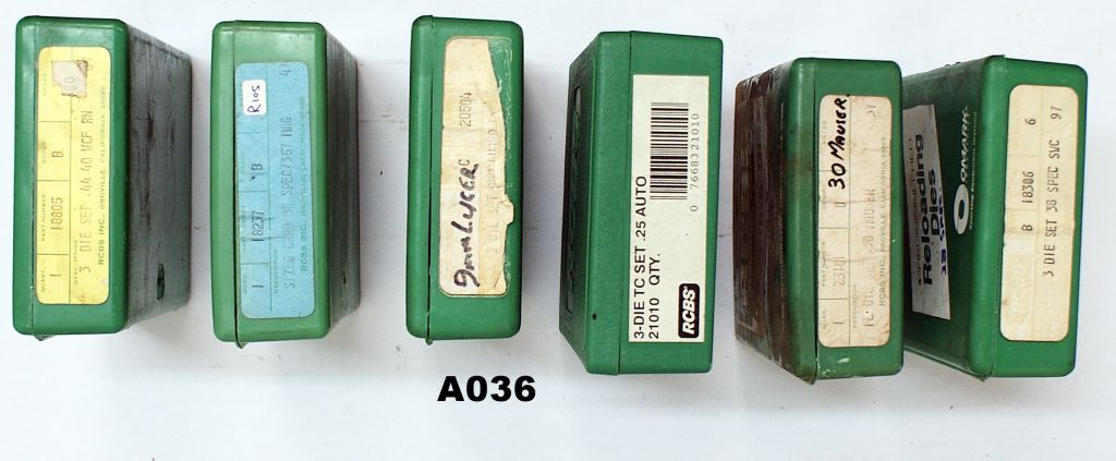 1) .30 Mauser. 2) .25acp. 3) .44-40wi.n 4) .38spl 5) 9mm Luger. 6) .38×357 Carbide sizer. All dies like new.