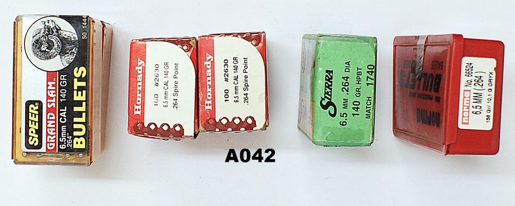 100 x Sierra 140gr HPBT; 164 x Hornady 140 gr Spire Point; 100 x Speer 140gr Big Game; 100 x Noma 156gr Oryx.