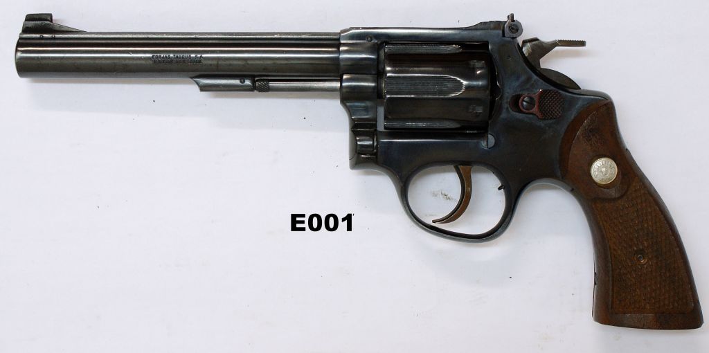 Ribbed 6 barrel with adjustable sights. Chequered wooden grips factory logo to them. Good plus condition.