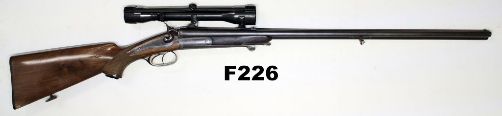 Fitted with “M.S.W.” 4×36 “Wetzlar” scope on see-through QD mounts. Hammer gun with back action sidelocks and 27,5″ barrels with two leaf rear sights. Le Faucheux type action. Stock is of a chequered pistol grip configuration with cheekpiece Barrels are marked “T. Schunlieb in Ferlach”. Good rifle bore, shotgun bore displays some light pitting to it. Good overall condition.