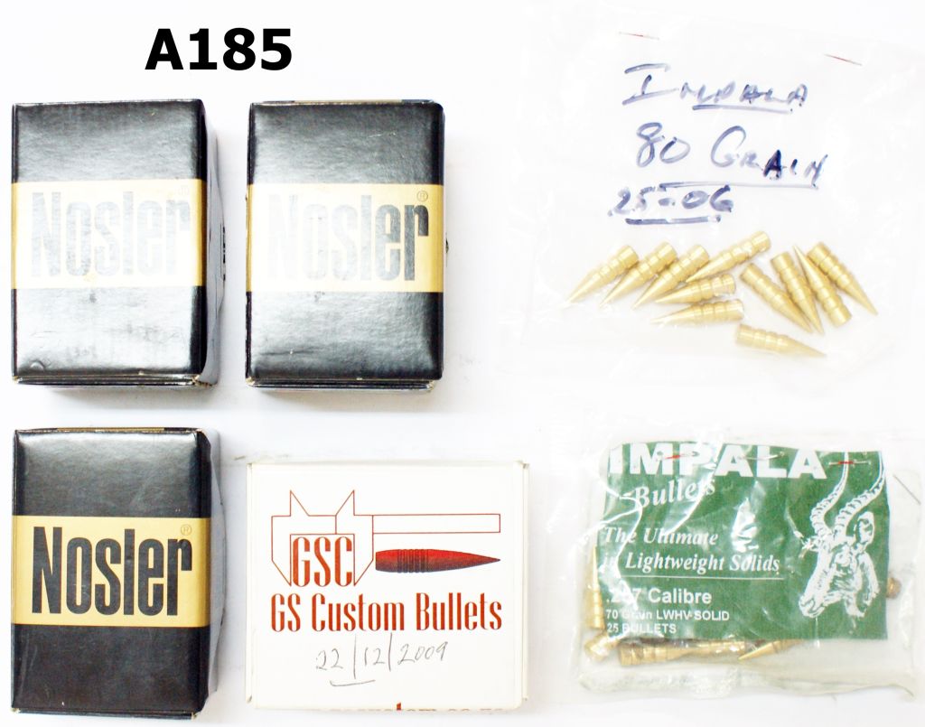 1) .25cal (.257) Nosler Ballistic Tip 100gr Spitzer x 150. 2) 25cal GS Customs 85gr HV Bullet Heads x 22. 3).25 Impala 70gr LWHV x 18. 4) .25cal Impala 80gr LWHV Bullet Heads x 11.