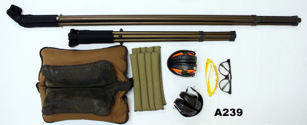1) Short shooting tripod x 1. 2) Long shooting tripod x 1. 3)Shooting X-bag x 1. 4) Stabilizing shot bags x 2. 5) Shooting glasses x 2. 6) Ear muffs x 2.