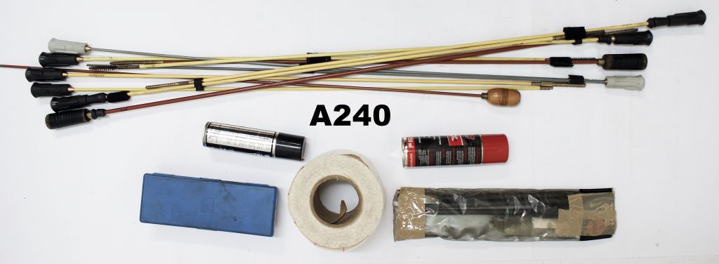 1) Cleaning rods – .22 to .45 cal x 10. 2) Various brushes, jags, mops – .22 to .45 cal. 3) Shotgun cleaning kit. 4) 1/2 roll of 2×4’s & oils.
