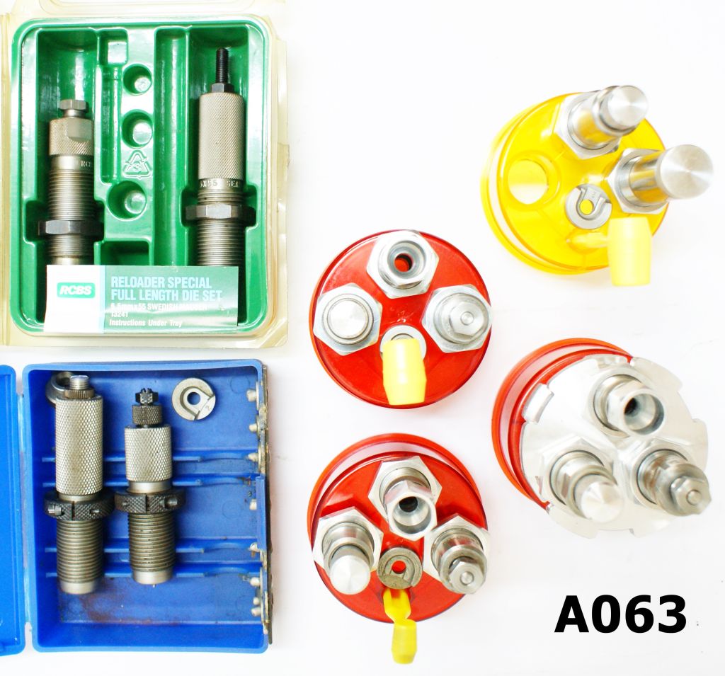 1) .25acp Lee dies. 2) .455web Lee dies. 3) .454casull Lee dies. 4) 7×57 Simplex dies. 5) 6.5×55 Mauser RCBS dies. 6) 7x57mm Mauser Lee Collett.