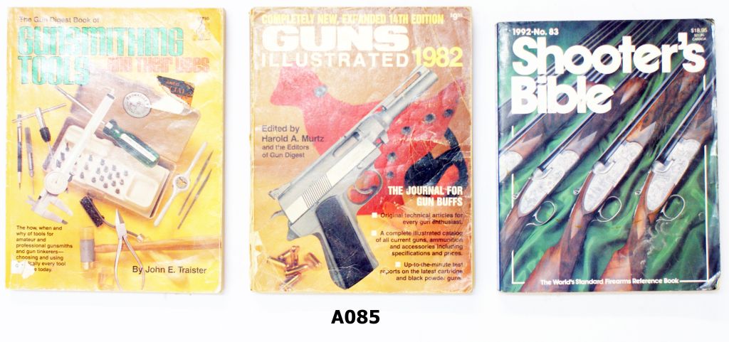 1) Gunsmithing Tools And Their Uses by John E Traister. Soft cover, illustrated, 256 pages. 2) Guns Illustrated 1982 Expanded 14th Edition edited by Harold A Murtz and the editors of Gun Digest. Soft cover, illustrated, 320 pages. 3) Shooters Bible 1992 – No. 83. Soft cover, illustrated, 576 pages.