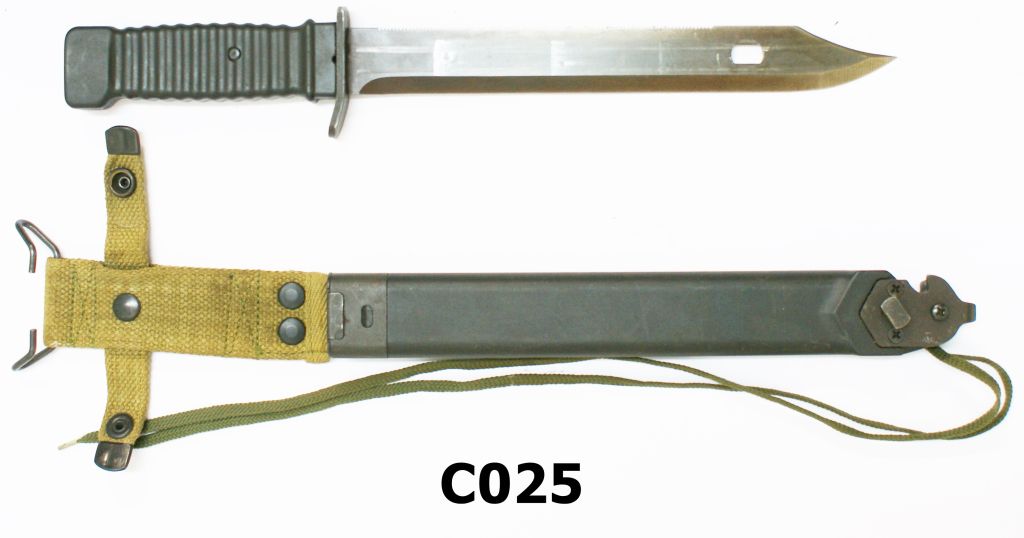 Similar design to the successful Carl Eickhorn KCB77 bayonet with wire cutter to the bottom of the black synthetic scabbard. Bowie type blade of 247mm with serrated back of blade. Excellent condition.