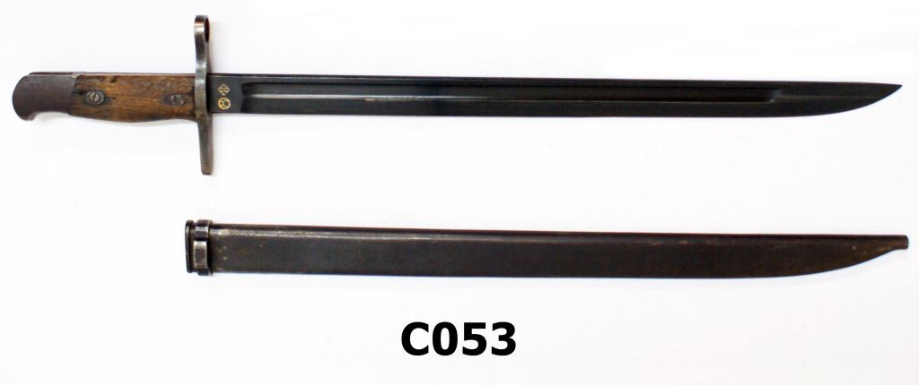 Manufactured by Nagoya arsenal. This is the earlier Type 30 series with a flat bird’s head pommel, but straight type crossguard and contour wraparound grips secured by rivets. Bright fullered blade of 395mm, it is equipped with a steel scabbard. Good to good plus condition.