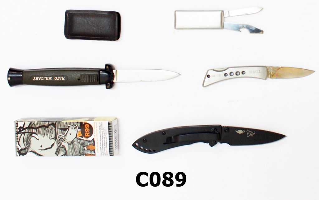 1) Folding lock-blade with belt-clip, S.A. Hunters “Rhinos Alive” knife with 75mm blade-boxed, as new. 2) “Nato Military” marked switchblade with 80mm blade. As new. 3) “Basic Tools” “Silver Falcon” lockblade with 60mm blade. Excellent. 4) Square profile, stainless small pocket knife with 2x 45mm blades. “As new”.