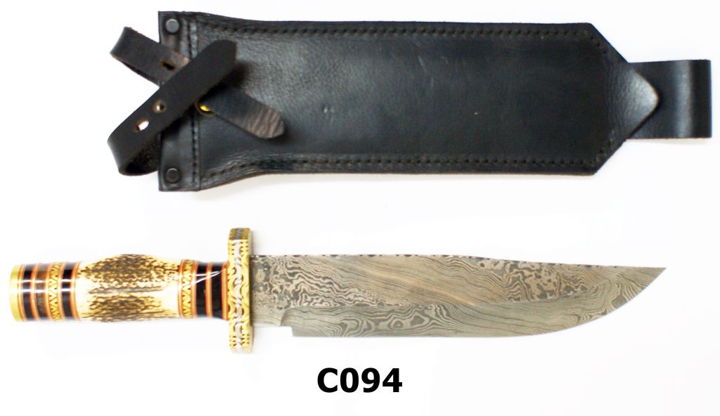 Stag horn handle and guard detailed with detailed brass and silver work. Fine Damascus blade of 25x5cm. Overall length of 40cm. With a black leather sheath. A very fine and upmarket piece in mint condition.