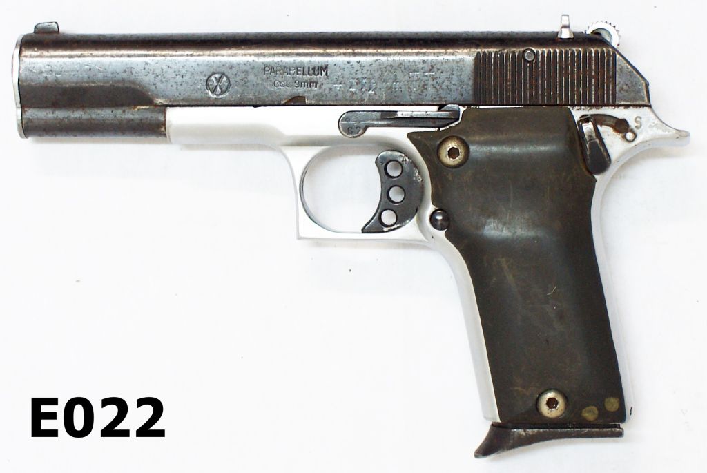 A variant of the Tokarev pistol in 9mmp calibre. Hooked trigger guard to satin nickel finished frame. Slide displays pit marks to blued finish. Fair condition.