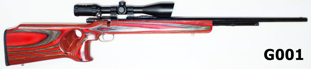 Fitted with red and grey laminated thumb hole wood stock with Nikko Stirling 3-9X Night-eater scope. Tubular magazine to 25″ barrel. Excellent refinished condition.