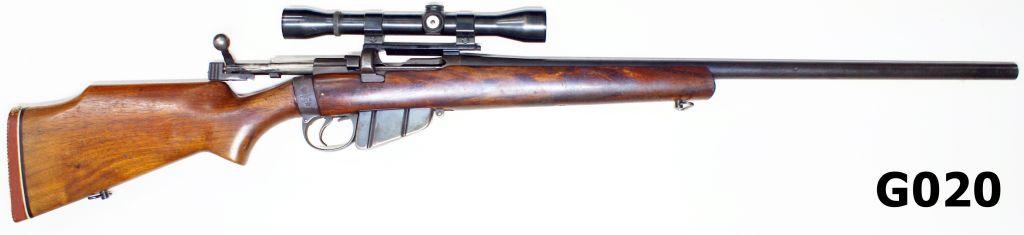 Weaver 4X scope to SMLE No.1 Mk3 action. Reasonably heavy profile [muzzle OD of ] 25,75″ barrel. Monte-Carlo styled walnut stock and fore-end. Musgrave recoil pad to butt.