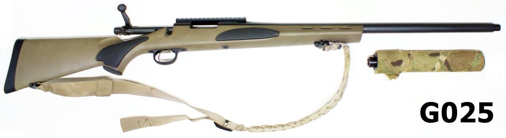 Rifle has a heavy profile 24″ with suppressor fitted. Beige & black synthetic stock with ventilation to broad fore-end. Tactical rail to action. Matt black finish. Excellent overall condition.
