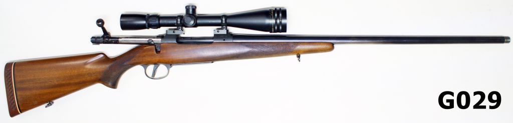 Fitted with Lynx 6-24X42 scope on Lynx type steel mounts. Classic styled stock with chequered wrist and fore-end and straight butt with replacement recoil pad fitted to it. Rifle has been re-barrelled with a heavier profile 26″ barrel and the muzzle is threaded for a silencer.