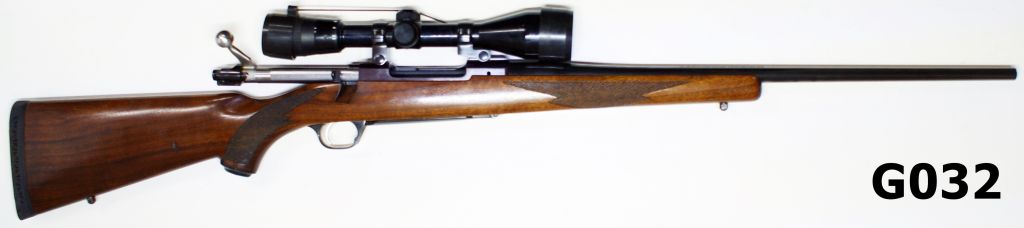 Fitted with Nikko Stirling Platinum 3,5-10×45 WA scope on factory mounts. Barrel of 22″, walnut stock with chequered wrist & fore-end. All in very good plus condition.