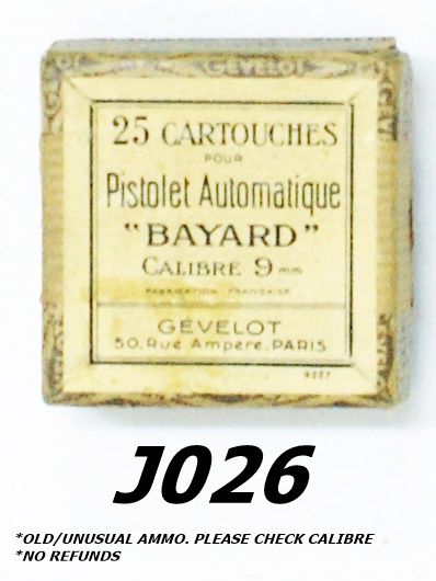 25 Cartouches Pour Pistolet Automatique “Bayard”, calibre 9mm, Gevelot, Paris.