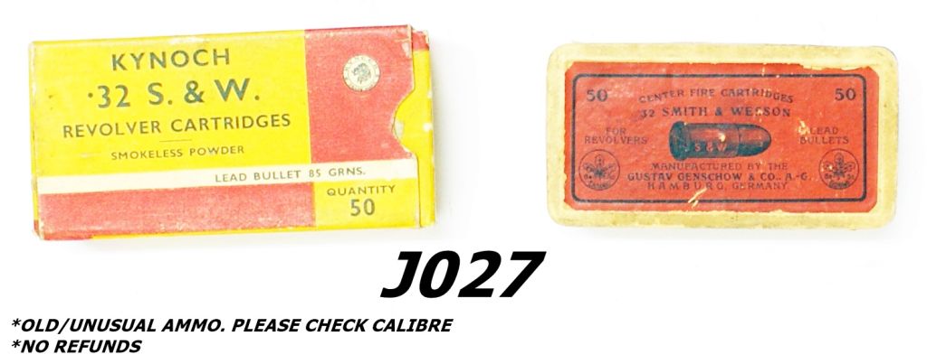 1) Kynoch .32s&w Revolver cartridges, smokeless powder, lead bullet 85gr. 2) Center fire cartridges .32 Smith & Wesson for revolvers, Manufactured by the Gustav Genshow & Co. R.L. Hamburg Germany.