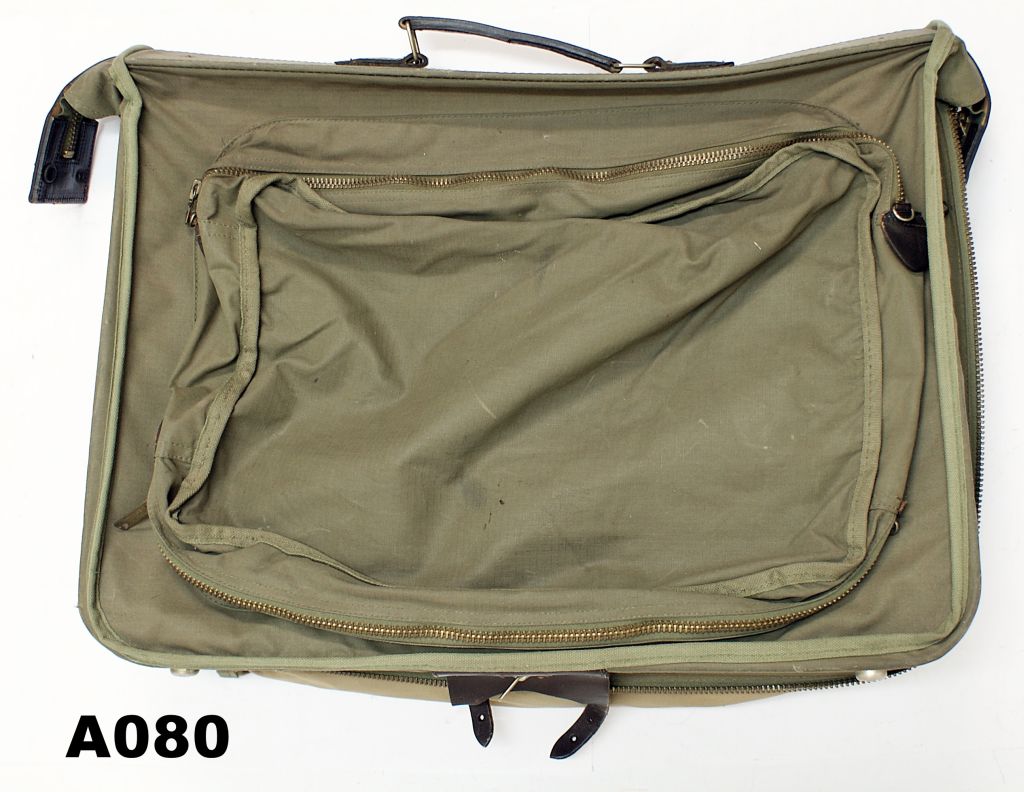 Officer’s green military suitcase. Canvas with leather trim. Zipper pouches to each side and three inner compartments with provision for step-out clothing. Very good condition.