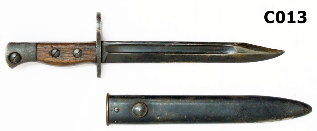 Steel scabbard, wooden grips, “Sterling” marked blade. This bayonet was used on both the No.5 Jungle Carbine and the Sterling SMG. Good to good plus condition.