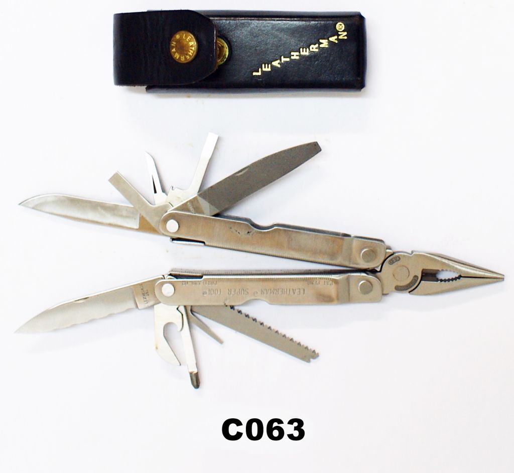 Includes leather sheath. Tool includes pliers, file, saw blade, serrated blade, regular blade, screwdrivers and can/bottle opener. Very good condition.