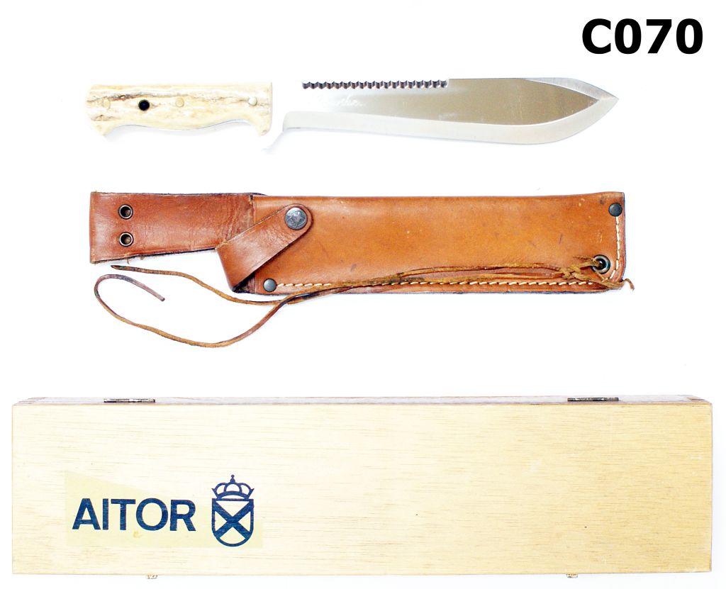Knife Marked “Aitor Survival 21 = 8-1/4″ Inoxidable – Stainless Steel – Spain”. A Previous owner’s initials and surname professionally engraved onto the reverse of the blade in a neat script. Stag horn grips form part of the handle. Upper part of the blade serrated. Complete with leather scabbard and in a wood box. In an unused condition.