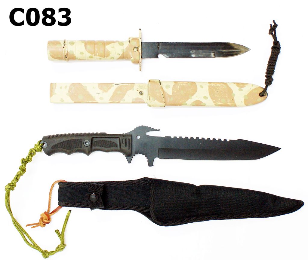 1. Dark finished blade of 220mm marked “Dark Operations Fighting Knives Cobalt Tungsten Vanadium Stainless Steel”. Composition handle, black nylon sheath. 2. Camo finished handle & sheath with compass set into the handle. Blade of 160mm. Good condition.