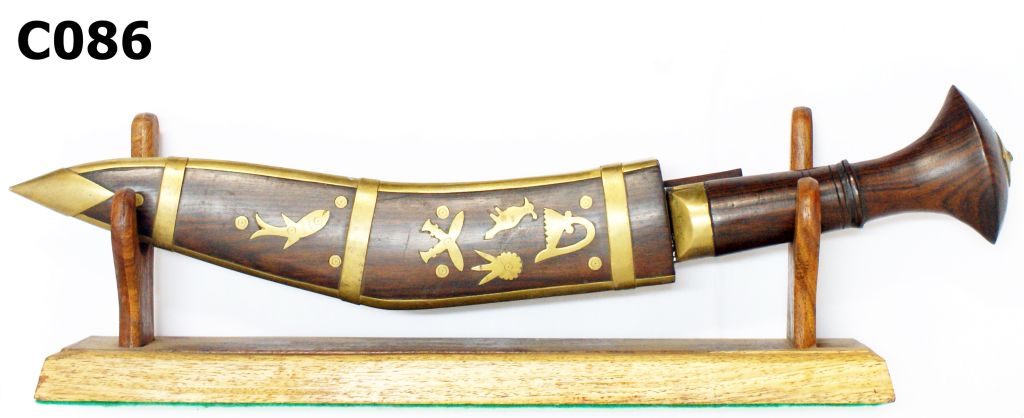 Curved blade of 260mm plus the customary two small blades. Wooden handles with some rather ornate brass inlay to the handles and sheath. Good plus condition.