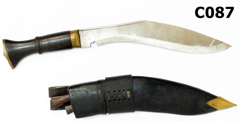 Curved blade of 260mm plus the customary two small blades. Wooden handles and sheath. Good plus condition.