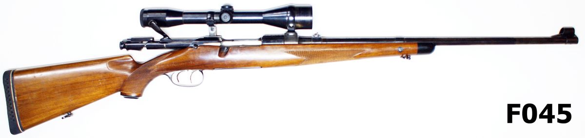 Rifle is fitted with Schmidt und Bender 6×42 scope on Austrian hook & claw mounts. Receiver of rifle is marked, “Made in Austria Original Mannlicher Schoenauer mod. GK kal. 7×64”. Sidewall of receiver is marked “Steyr- Daimler- Puch A. G. Steyr”. Manufactured 1959, this is widely regarded as one of the best Mannlicher models produced, before they went over to cost- saving plastic & alloy construction. Open sights to 24″ barrel with banded front sight. Low swept bolt, double trigger mechanism, side & leaf safeties. Stock is of classic styling with dark fore-end tips and gripcaps, wrap-around chequering to fore-end, two panel chequering to wrist, shadow line cheekpiece and ventilated Pachmayr White Line recoil pad to butt. Very good plus overall condition.