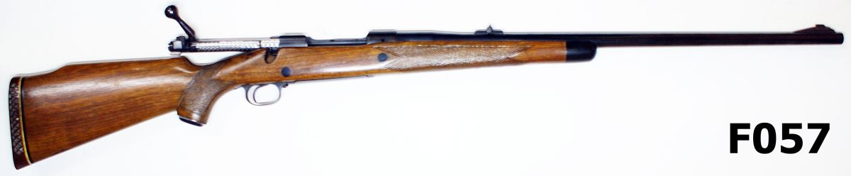 Manufactured 1958. Hinged floorplate marked “Supergrade”, black fore-end tip and “Pachmayr White line” marked ventilated recoil pad. Wrap-around chequering to fore-end & wrist. Capped pistol-grip stock with cheekpiece. Double recoil lugs to action. Open sights to 25″ barrel. Rifle is in good refinished condition with markings which are still crisp. Good bore. Sling swivels have been removed and holes to stock have been plugged.