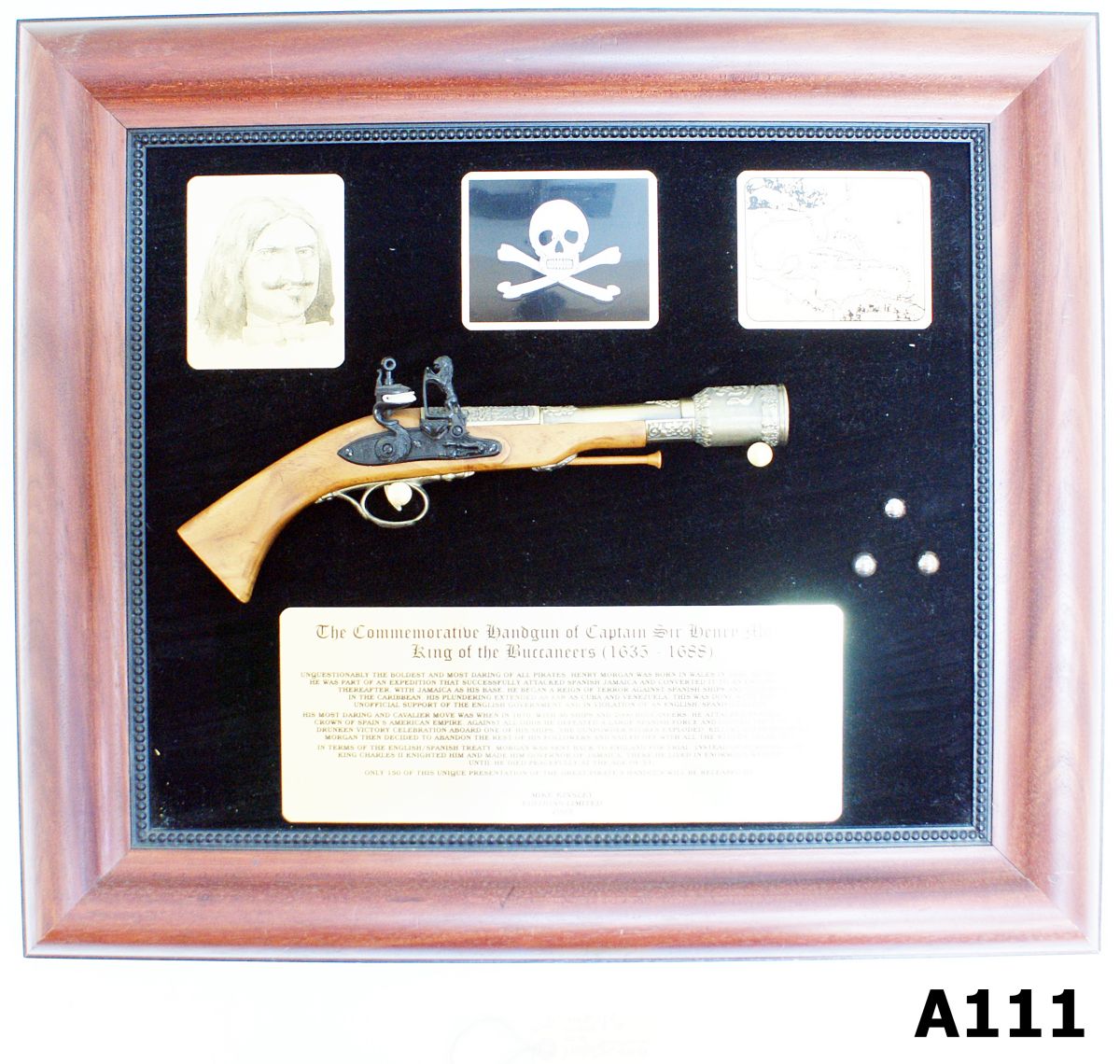 Modern repro board featuring a flintlock pistol and the history of Captain Sir Henry Morgan. Limited edition, excellent condition.