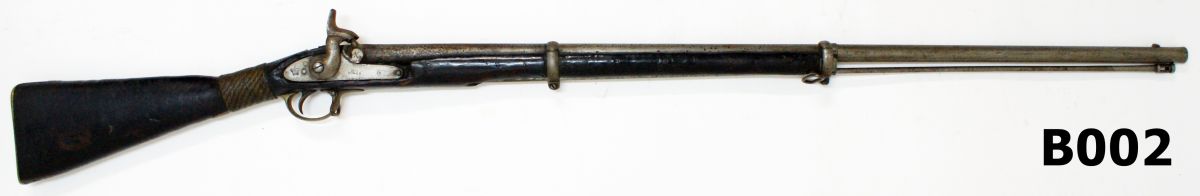 Lockplate marked “Crown 1861 Tower”. Includes ramrod. Barrel of 36″. Fore-end has been “circumcised” just ahead of the 2nd band. Copper wire binding to grip. Rifle displays considerable wear, suitable for use as a “spares” rifle or a wall-hanger.