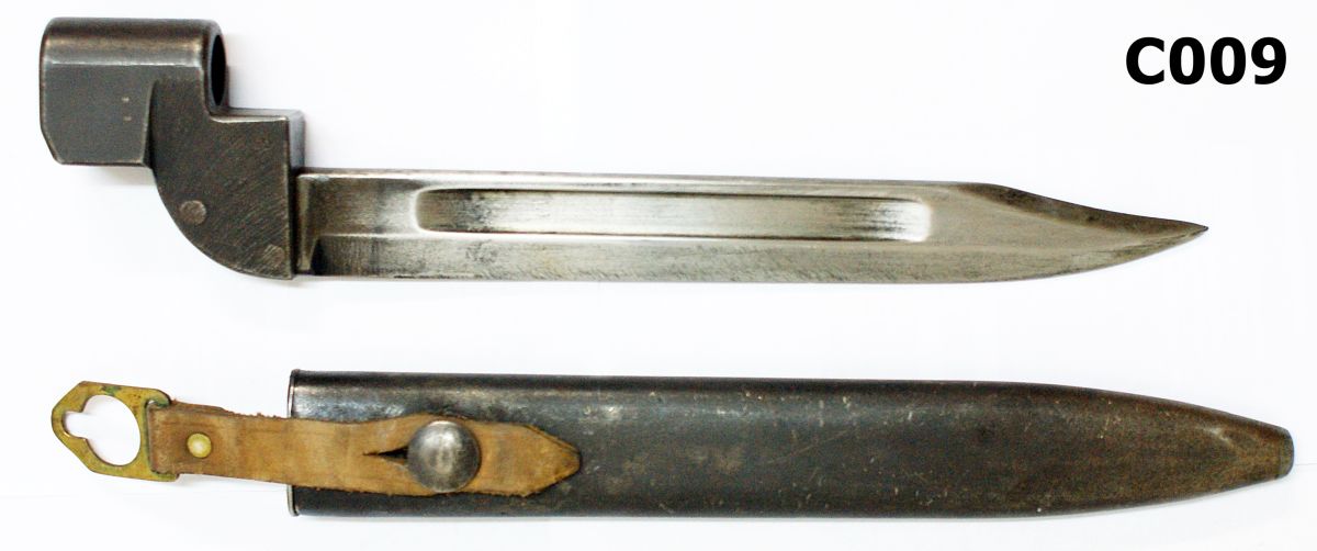 Bowie bladed bayonet for the No.4 rifle. Steel scabbard with leather securing tang to it. Good condition.