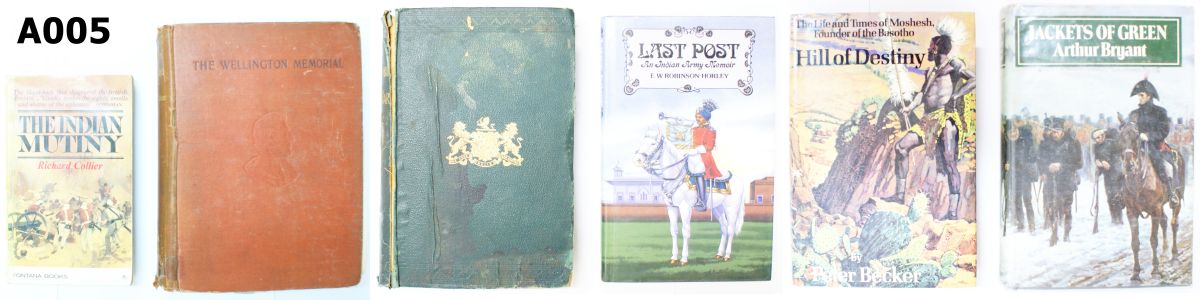 1) Hill Of Destiny by Peter Becker. Hard cover, illustrated, 294 pages. 2) With Lord Stratford In The Crimean War by James Henry Skene. Hard cover, 352 pages. 3) The Wellington Memorial by Major Arthur Griffiths. Hard cover, illustrated, 358 pages. 4) Jackets of Green by Arthur Bryant. Hard cover, illustrated, 478 pages. 5) Last Post by E W Robinson-Horley. Hard cover, 178 pages. 6) The Indian Mutiny by Richard Collier. Soft cover, illustrated, 349 pages.
