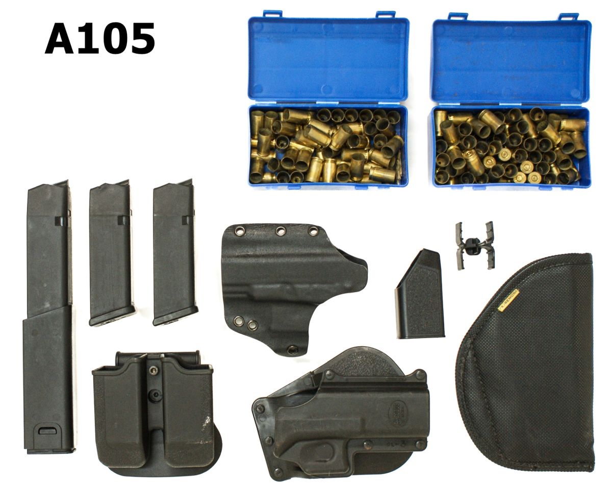 2 x 13 round magazines; 1 x G30 extended magazine; 2 x Fobus type holsters; 1 x inside remora holster; 1 x IMI double mag holster; 100 x once fired brass in plastic boxes
