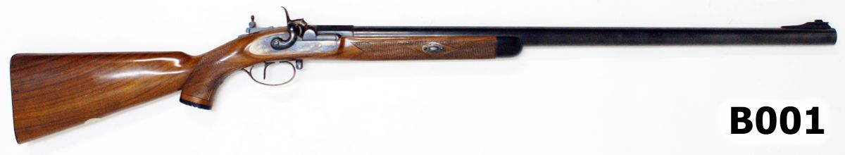 The ultimate muzzleloader big bore hunting rifle? Barrel length of 29″ with ramp fore-sight and peep rear sight to the tang. Dark fore-end tip, wrap-around chequering to fore-end, two-panel chequering to grip. Case hardened lock and hammer. Extended tang to blued steel buttplate.