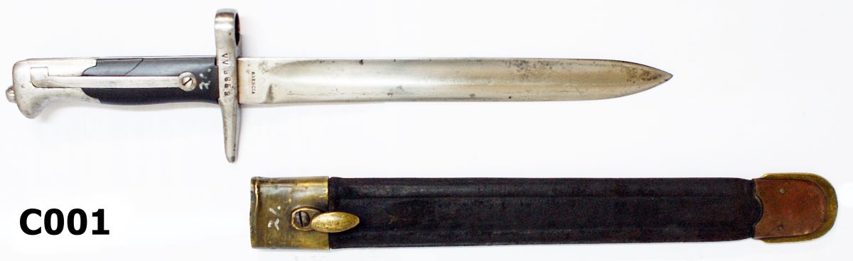 Leather scabbard with brass mounts dated 1889. ‘Brescia” marked ricasso. Officially shortened blade. Long spring to hilt. Good overall condition.