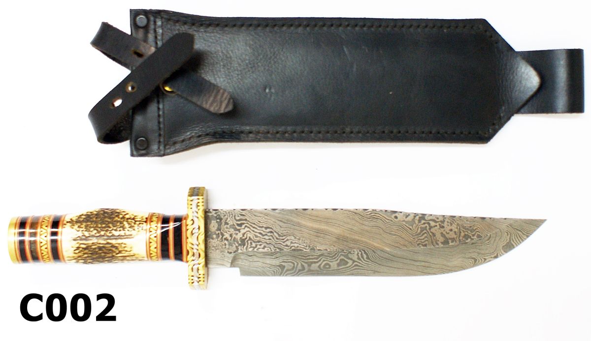 Stag horn handle and guard detailed with detailed brass and silver work. Fine Damascus blade of 25x5cm. Overall length of 40cm with a black leather sheath. A very fine and upmarket piece in mint condition.
