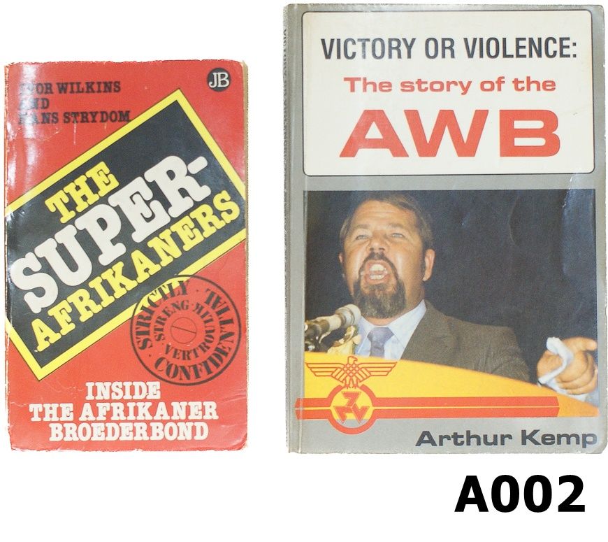 1) “The Super Afrikaners” by Ivor Wilkns and Hans Strydom. Soft cover. 749 pages. Fair condition. 2) “Victory or Violence: The Story of the AWB” by Arthur Kemp. Soft cover. 183 pages. Fair condition.