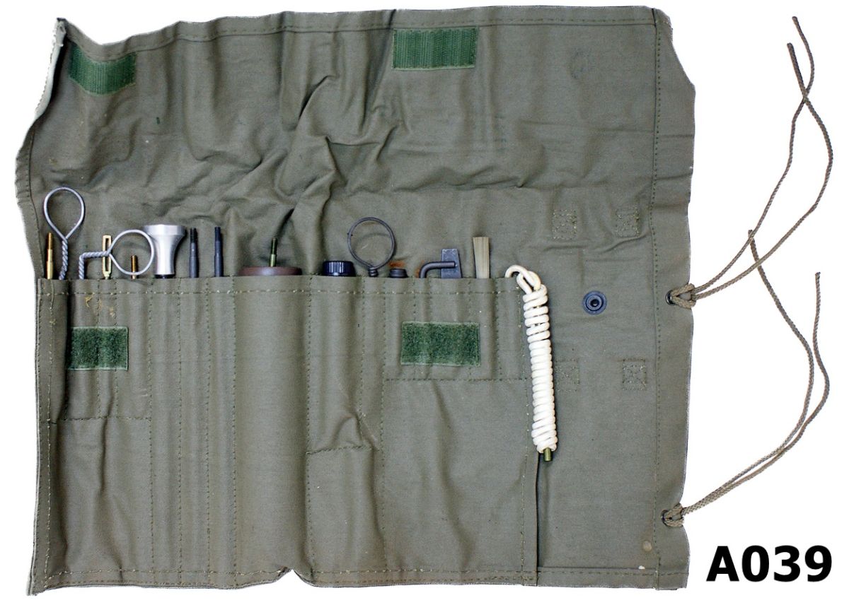 Canvas holder. Includes metal cleaning/ram rod. nylon pull through. sight tool/screwdriver. gas hole reamer. Ruptured case remover. oil bottle. gas tube brush. nylon barrel brush. brass barrel brush. brass chamber brush. general purpose brush.