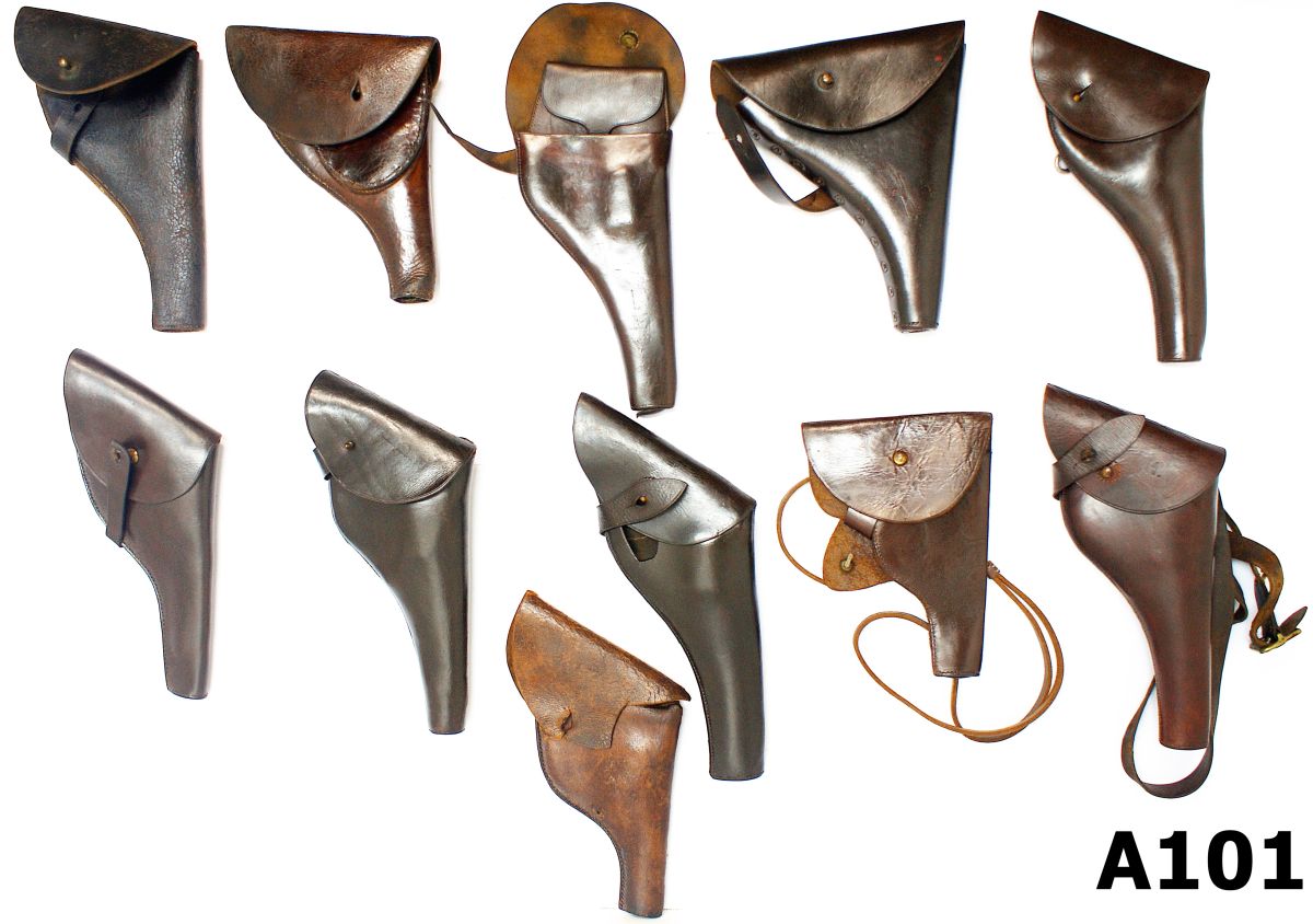 Six Xlarge British military flap type holsters for 6″ revolvers. one with additional handcuff pouch. Three x 4″ British military type. one with integral handcuff pouch. One military type with UDF stamps for 9mm Webley pistol?. One with numerous markings. for .455 Webley pistol. Made by “T.G Galley Rickmansworth 1912” and inside of flap marked to “K.M. Fardell 30-V11-1914 & Web.455 133820” in very good condition.