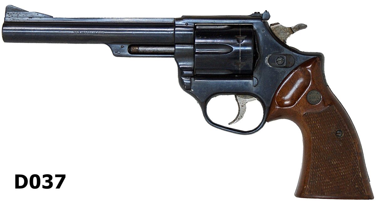 Adjustable sights to ribbed 6″ barrel. chequered wooden factory grips. blued finish. Good condition.