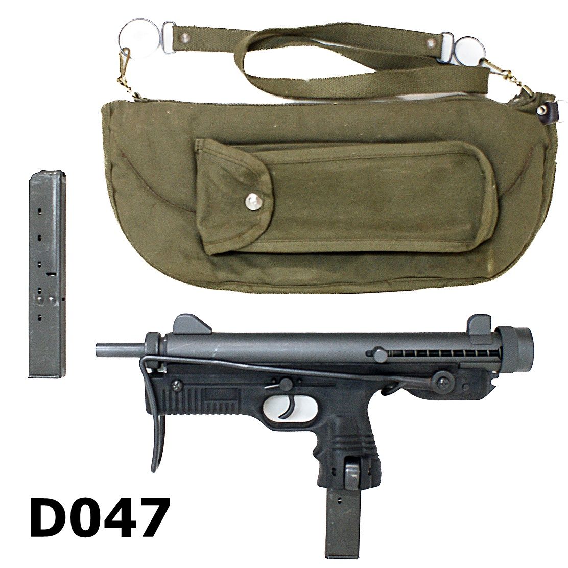 Rhodesian designed. South African built HMC with 8″ barrel. folding wire butt and 25 round Uzi magazine. telescoping bolt. Good condition.