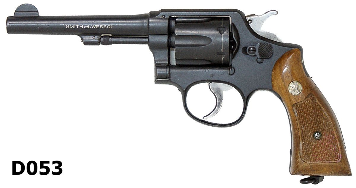 S&W logo to chequered wood grips. M&P model purchased at the commencement of WW2 by the SA authorities. UDF markings to topstrap. Very good condition.