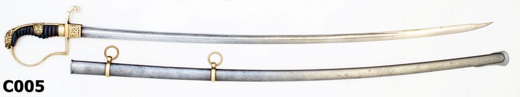 Curved, fullered, flat back blade of 33″ with extensive scroll etching to it. Brass handle with lion’s head and crossed swords to langets. scroll covered ears to fish-skin covered grip. Steel scabbard with brass hangers. Sword is in good original condition.